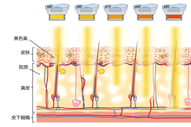 将称作IPL(Intense Pulsed Light)的柔和光照射与肌肤。特质上可被黑红色素吸收,对表皮层的黑色素以及毛细血管内的红血球即可起到反应。