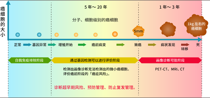 此检测不是针对从双亲继承的遗传性(体质)隐患,而是检测因受生活习惯・生活环境・压力・增龄等后天因素影响而增大、以及在形成癌症前的极小癌细胞存在的可能性。得知将来的癌症隐患有助于预防癌症。