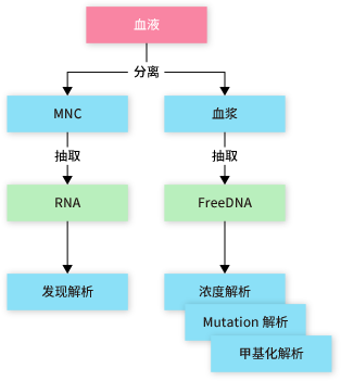 从血液当中抽取DNA和RNA等遗传物质,检测其浓度以及游离在血液中的与癌症相关约70多种基因。同时将形成癌症之前的极小癌细胞。存在的可能性表示为1~100作以数字化并对其进行评价。