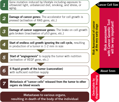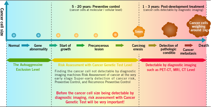 Generally speaking, the recent advances of testing equipment such as PET, CT, MRI, endoscope, etc., allows diagnosis of cancer of as 5 mm in size, however, a cancer of 5 mm in size is already a “mature” cancer consisting of more than a billion cells.