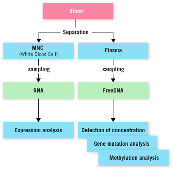By collecting gene such as DNA and RNA from blood, then analyzing their concentration and approximately 70 kinds of cell-free gene related with cancer in the blood, and then succeed in numerically indicating the risk of cancer on a scale of 0 to 100.