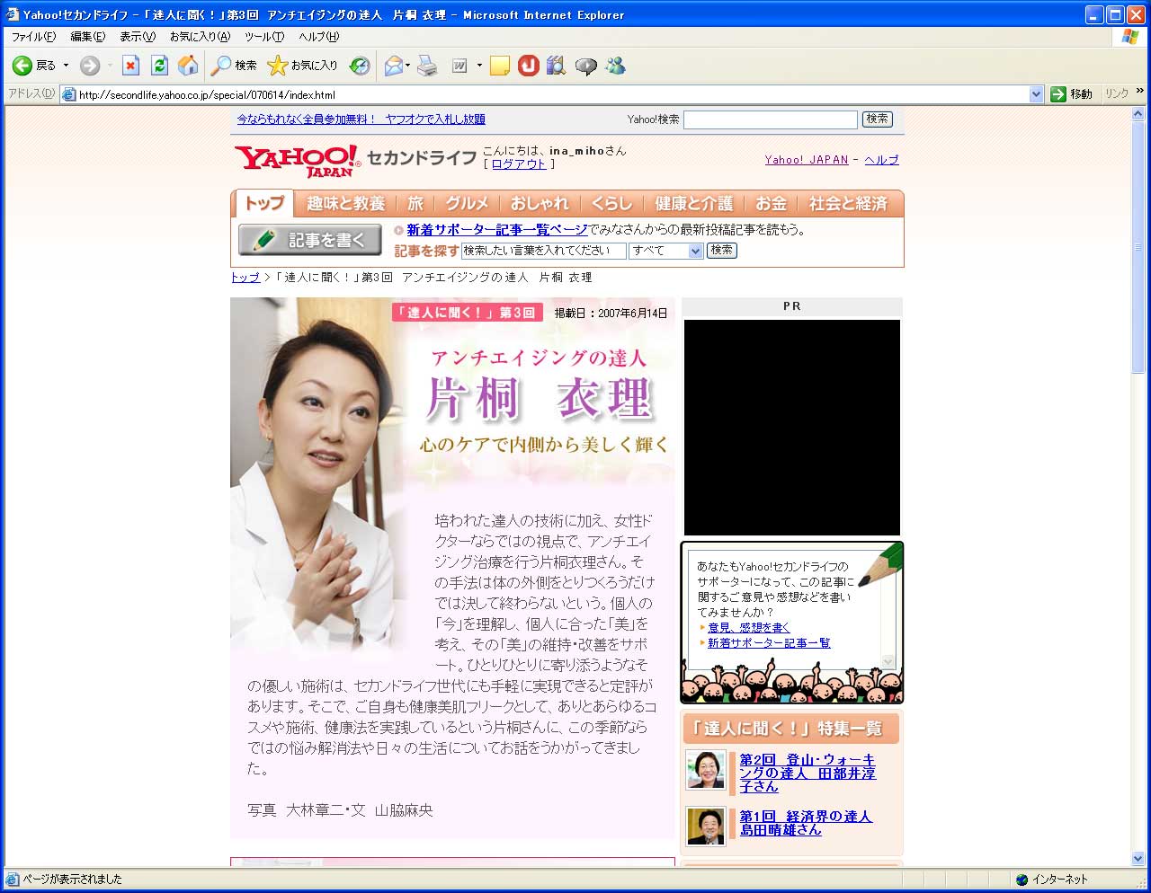 Yahoo!セカンドライフに衣理クリニック表参道院長 片桐衣理が出演しました