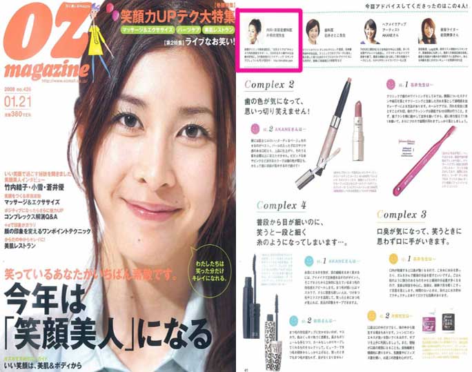 「オズマガジン426号」企画「コンプレックス解消で笑顔にもっと自信を」の中で、衣理クリニック表参道(エリクリニック)院長 片桐衣理が「笑顔にまつわるコンプレックス解消法」をレクチャーしています。