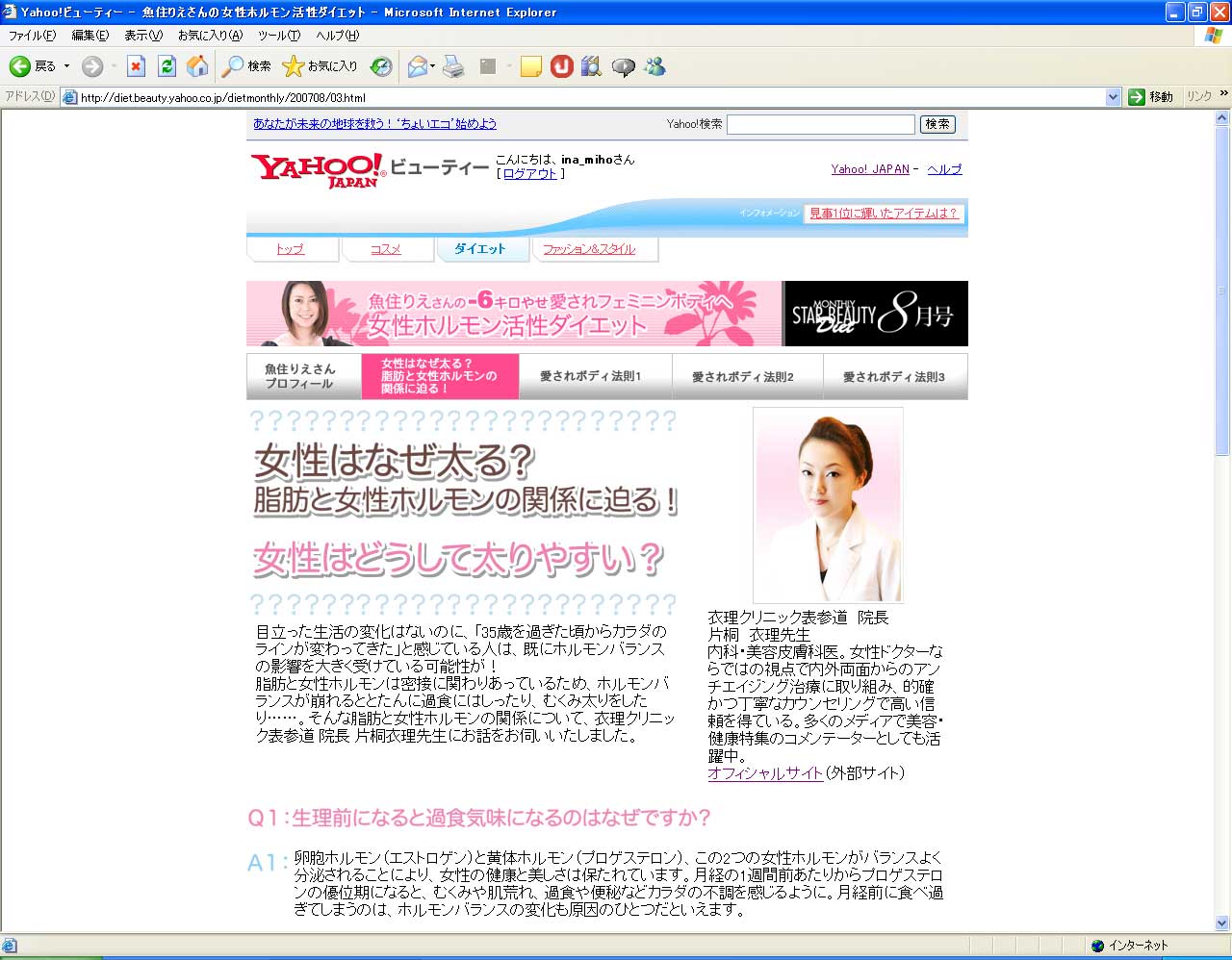 「Yahoo!ビューティー」ダイエット企画「魚住りえさんの女性ホルモン活性ダイエット」の中で、衣理クリニック表参道(エリクリニック)院長 片桐衣理が「脂肪と女性ホルモンの関係」について解説しています。