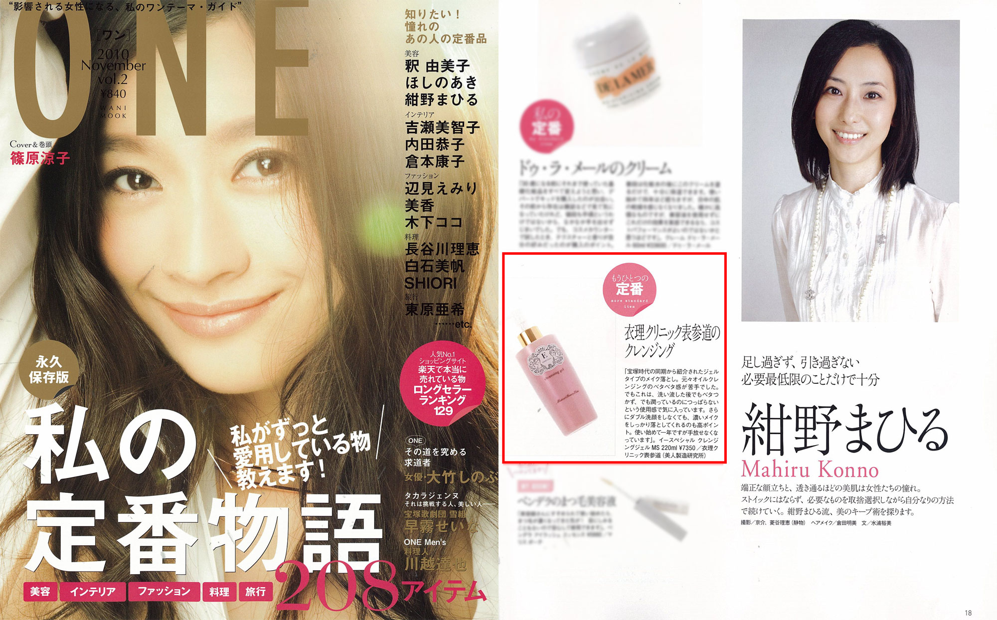 『ONE』Vol.2、「私の定番物語」にて、女優の紺野まひるさんより、衣理クリニック表参道院長 片桐衣理がプロデュースしたドクターズコスメ「イースペシャル クレンジングジェル」をご紹介いただきました。是非、ご覧下さいませ。