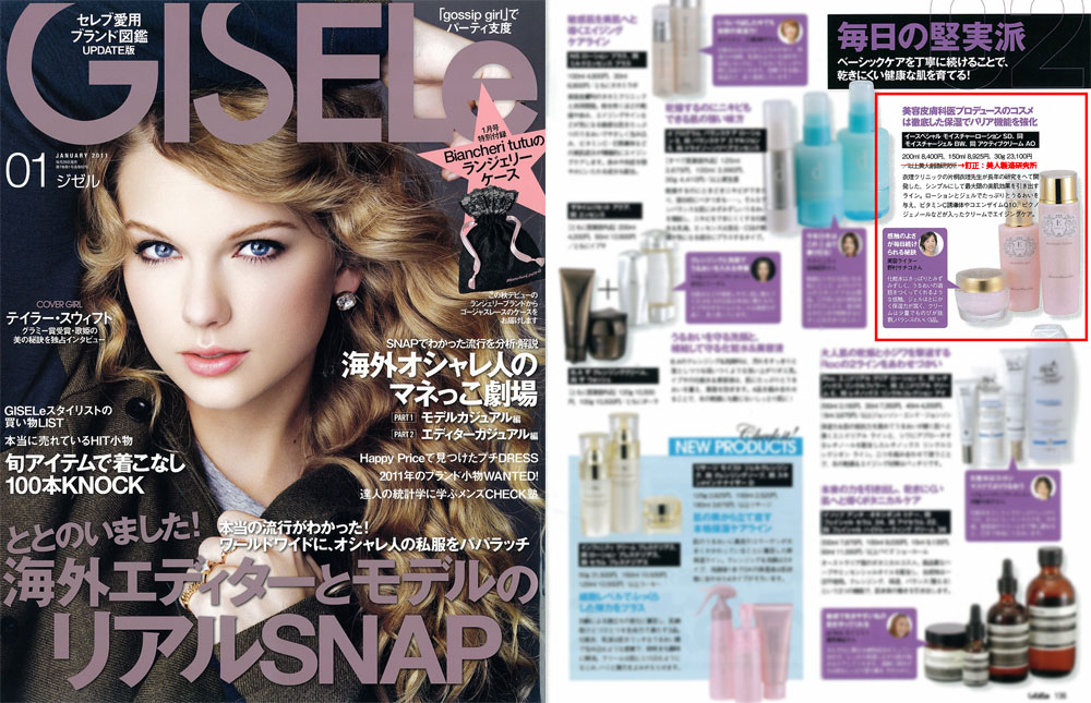 『GISELe』1月号、「乾燥肌をうるおすスキンケアコース」にて、美容ライター 野村サチコさんより衣理クリニック表参道院長 片桐衣理が所長を務める【美人製造研究所】より、イースペシャルモイスチャーローション・モイスチャージェル・アクティブクリームをご紹介いただきました。