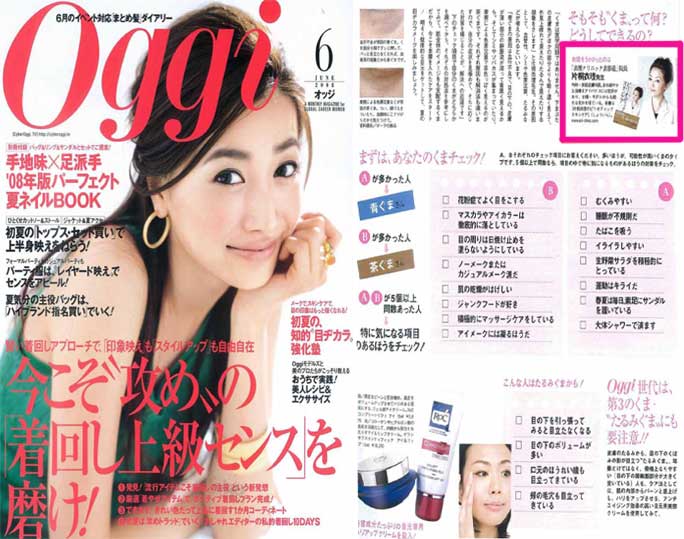 「Oggi6月号」企画「今度こそ本気の青グマ茶グマ撃退テクニック」の中で、衣理クリニック表参道院長 片桐衣理が「青グマ・茶グマの見分け方、それぞれの原因と対策、解消法」等についてアドバイスしています。