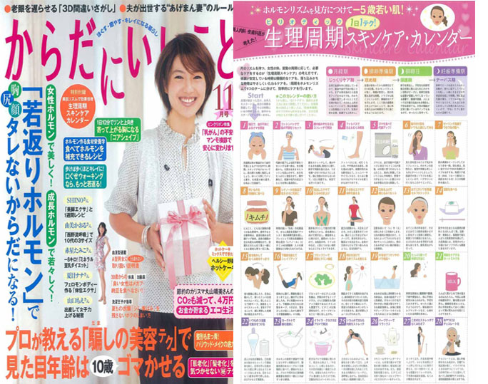 「からだにいいこと11月号」企画特別付録「生理周期(ピリオディック)スキンケア・カレンダー」を衣理クリニック表参道院長 片桐衣理が監修いたしました。整理周期に伴う体の変化とケア方法をカレンダー式でご紹介しています。