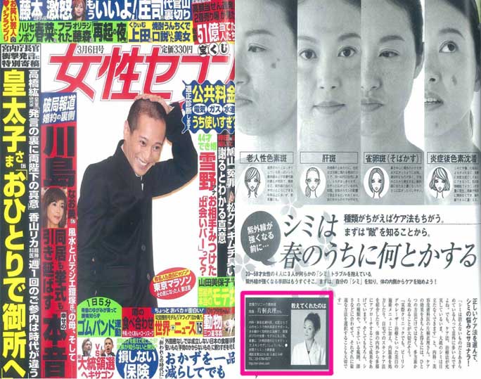 「女性セブン2月21日発売号」企画「シミは春のうちに何とかする」の中で、衣理クリニック表参道(エリクリニック)院長 片桐衣理が「シミの種類、それぞれの症状の特徴や原因、予防法、解消法について」解説しています。