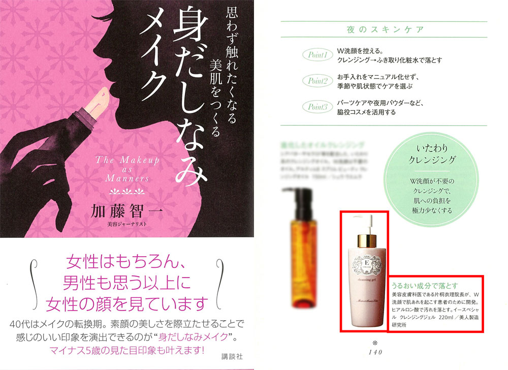 美容ジャーナリスト 加藤智一さん著書本『身だしなみメイク』内、「思わず触れたくなる美肌になる、身だしなみコスメ52」にて、衣理クリニック表参道院長 片桐衣理がプロデュースするドクターズコスメ“イースペシャル”より、「クレンジングジェル」をご紹介いただきました。是非、ご覧くださいませ。
