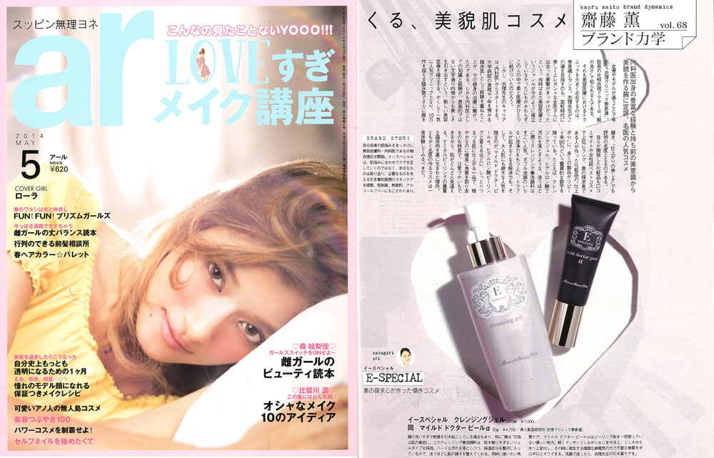 『ar』5月号、「齋藤薫 ブランド力学」にて、美容ジャーナリストの齋藤薫さんが、衣理クリニック表参道院長 片桐衣理がプロデュースするドクターズコスメ“イースペシャル”より、「クレンジングジェル」と「マイルドドクターピールα」をご紹介くださいました。是非、ご覧くださいませ。