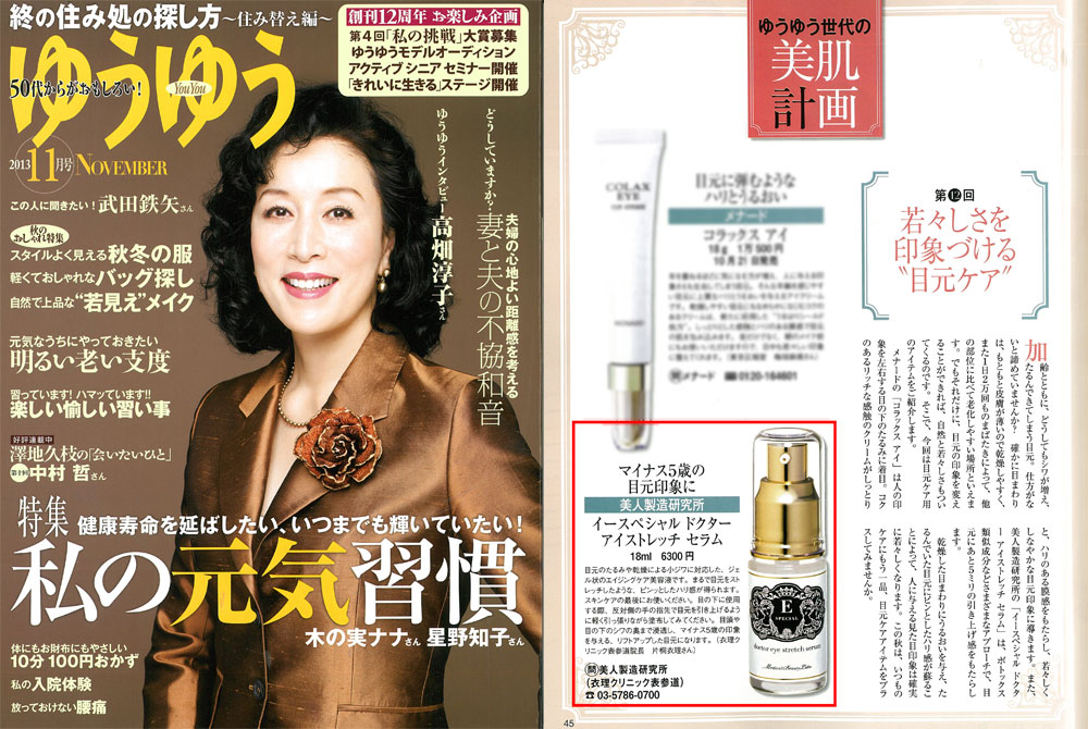 『ゆうゆう』11月号、「ゆうゆう世代の美肌計画」にて、衣理クリニック表参道院長 片桐衣理がプロデュースするドクターズコスメ“イースペシャル”より、目もと用美容液「ドクターアイストレッチセラム」が掲載されました。是非、ご覧下さいませ。