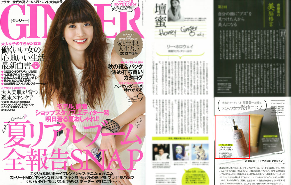 『GINGER』9月号、美容ジャーナリスト 加藤智一さんが連載する「大人の女の傑作コスメ」にて、衣理クリニック表参道院長 片桐衣理がプロデュースするドクターズコスメ“イースペシャル”より、「クレンジングジェル」をご紹介いただきました。是非、ご覧下さいませ。