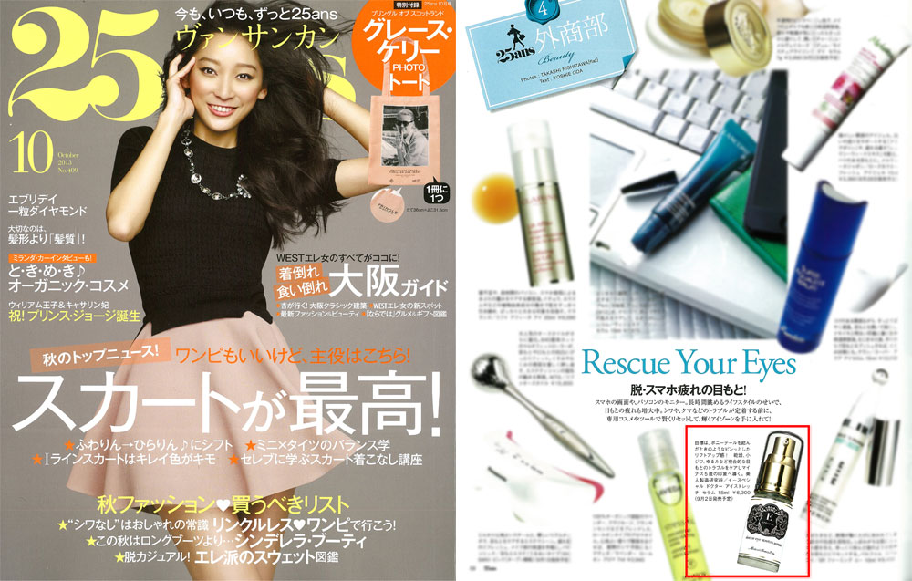 『25ans』10月号、「外商部 脱・スマホ疲れの目もと!」にて、衣理クリニック表参道院長 片桐衣理がプロデュースするドクターズコスメ“イースペシャル”より、9/2発売予定の目もと用美容液「ドクターアイストレッチセラム」が掲載されました。是非、ご覧くださいませ。