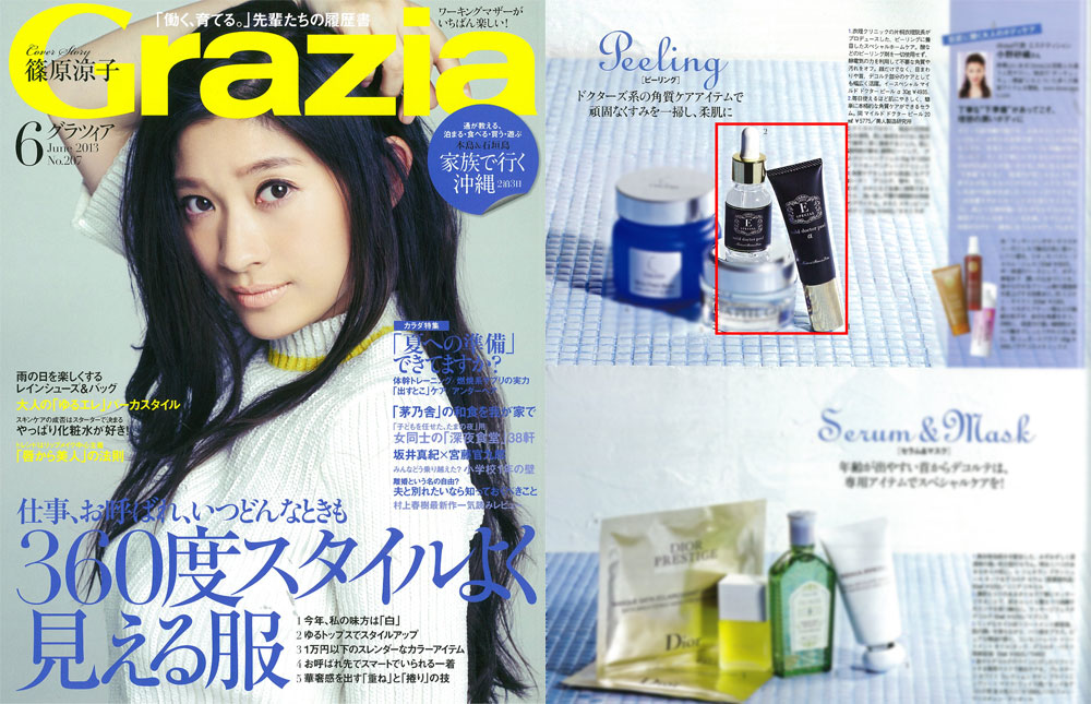 『Grazia』6月号、【デコルテ、ひじ、ひざ、そしてかかと!の「出すとこ」ケア】にて、衣理クリニック表参道院長 片桐衣理がプロデュースするドクターズコスメ“イースペシャル”より、「マイルドドクターピール」「マイルドドクターピールα」が掲載されました。是非、ご覧くださいませ。