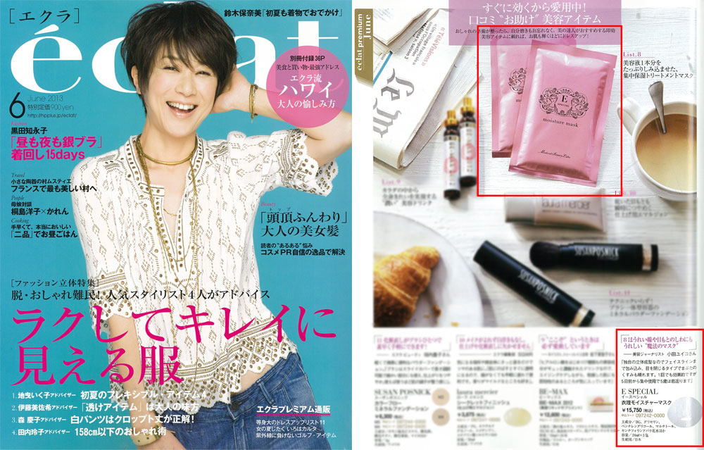 『eclat』6月号、「すぐに効くから愛用中!口コミ“お助け”美容アイテム」にて、美容ジャーナリストの小田ユイコさんが、衣理クリニック表参道院長 片桐衣理がプロデュースするドクターズコスメ“イースペシャル”「衣理モイスチャーマスク」をご紹介くださいました。是非、ご覧くださいませ。
