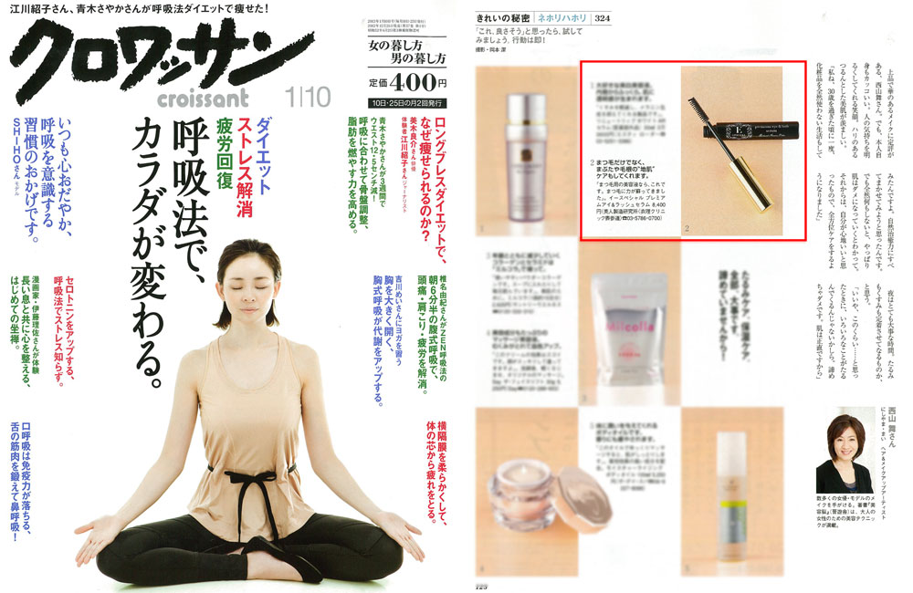 『クロワッサン』844号、「きれいの秘密 ネホリハホリ」にて、ヘア&メイクアップアーティストの西山舞さんより、衣理クリニック表参道院長 片桐衣理がプロデュースするドクターズコスメ“イースペシャル”「プレミアムアイ&ラッシュセラム」をご紹介いただきました。是非、ご覧下さいませ。