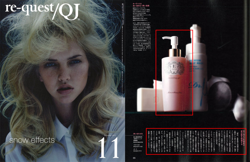 『re-quest/QJ』11月号、「潤い肌のための洗顔・新常識」にて、衣理クリニック表参道院長 片桐衣理が、洗顔の極意等についてコメントさせて頂きました。また、院長 片桐がプロデュースするドクターズコスメ“イースペシャル”より、「クレンジングジェル」・「マイルドドクターピールα」が掲載されました。