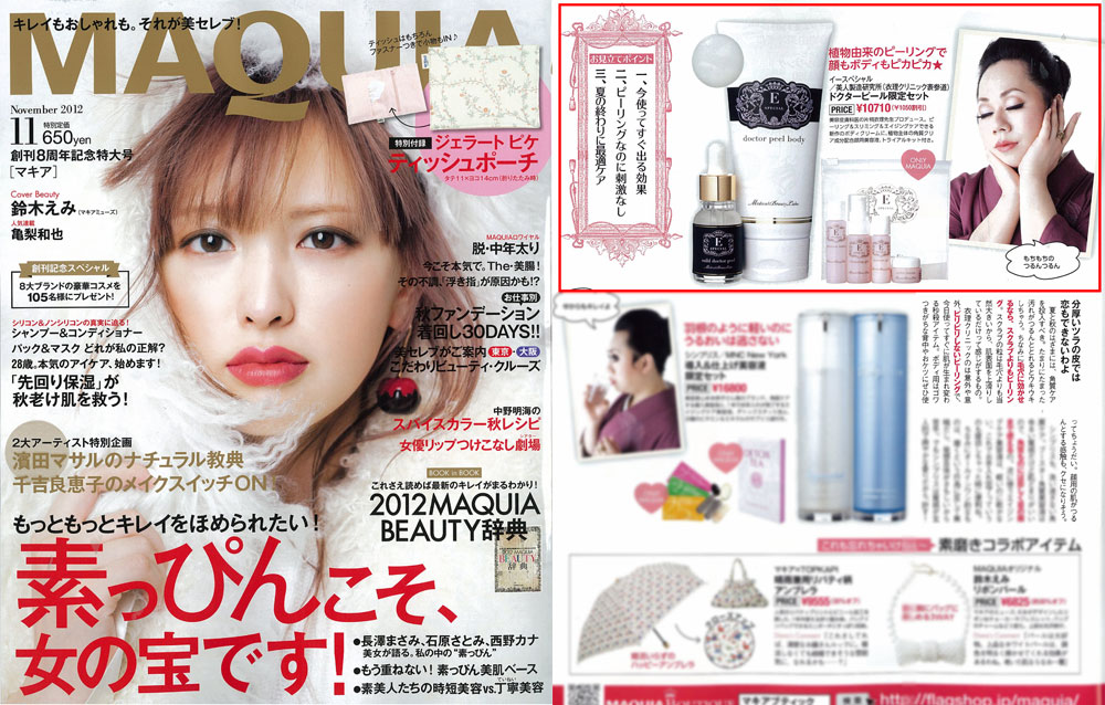 『MAQUIA』11月号、「世にも素敵なビューティ通販」にて、ダイアナ・エクストラバガンザさんより、衣理クリニック表参道院長 片桐衣理がプロデュースするドクターズコスメ“イースペシャル”をご紹介頂きました。「ドクターピールボディ」・「ドクターピール」に「トライアルセット」がついたMAQUIA特別限定セットが掲載されております。是非、ご覧下さいませ。