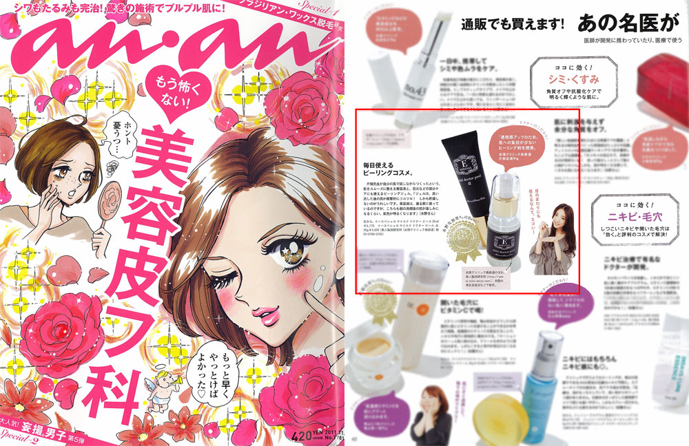 『anan』1781号、「あの名医が開発のコスメで艶プリ肌をゲット。」にて、衣理クリニック表参道院長 片桐衣理がプロデュースするドクターズコスメ“イースペシャル”より「マイルドドクターピール」と「マイルドドクターピールα」をご紹介頂きました。是非、ご覧下さいませ。