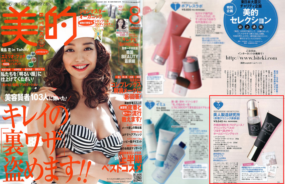 『美的』8月号、「美的セレクション」東日本大震災チャリティ企画に参加させていただきました。衣理クリニック表参道院長 片桐衣理がプロデュースするドクターズコスメ“イースペシャル”より、「マイルドドクターピール」と「マイルドドクターピールα」のセットにおまけもおつけして特別価格にてご提供させて頂いております。是非、ご覧下さいませ。