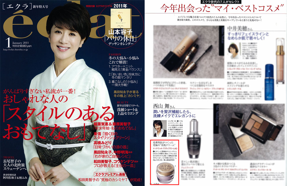『eclat』1月号、「2010ベストコスメグランプリ」にて、ヘア&メイクアップアーティストの西山舞さんより、衣理クリニック表参道院長 片桐衣理がプロデュースしたドクターズコスメ「イースペシャル アクティブクリーム」をご紹介頂きました。是非、ご覧下さいませ。