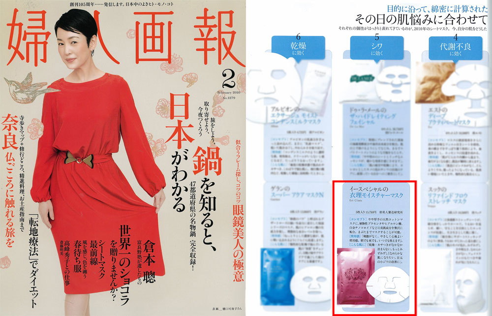 『婦人画報』2月号、ビューティジャーナリスト 倉田真由美さん監修「月に一度のエステより、週に一度のシートマスク」に衣理クリニック表参道院長 片桐衣理がプロデュースしたドクターズコスメ イースペシャル 衣理モイスチャーマスクが紹介されました。是非、ご覧下さいませ!