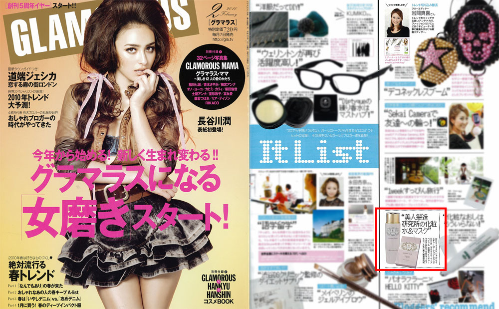 『GLAMOROUS』2月号、「ブログ界の女王が大予想!! 2010年HIT確実 It List」にて、フリーエディター 岩間真喜さんより、衣理クリニック表参道院長 片桐衣理がプロデュースしたドクターズコスメ イースペシャル モイスチャーローションと衣理モイスチャーマスクをご紹介いただきました。