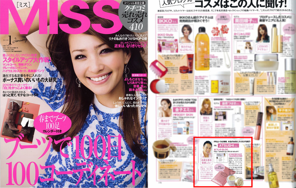『MISS』1月号の「人気ブログ発 コスメはこの人に聞け!」にて、PRコンサルタントのATSUSHIさんより、衣理クリニック表参道院長 片桐衣理がプロデュースしたドクターズコスメ イースペシャルの「アクティブクリーム」と「「衣理モイスチャーマスク」をご紹介いただきました。是非、ご覧くださいませ。