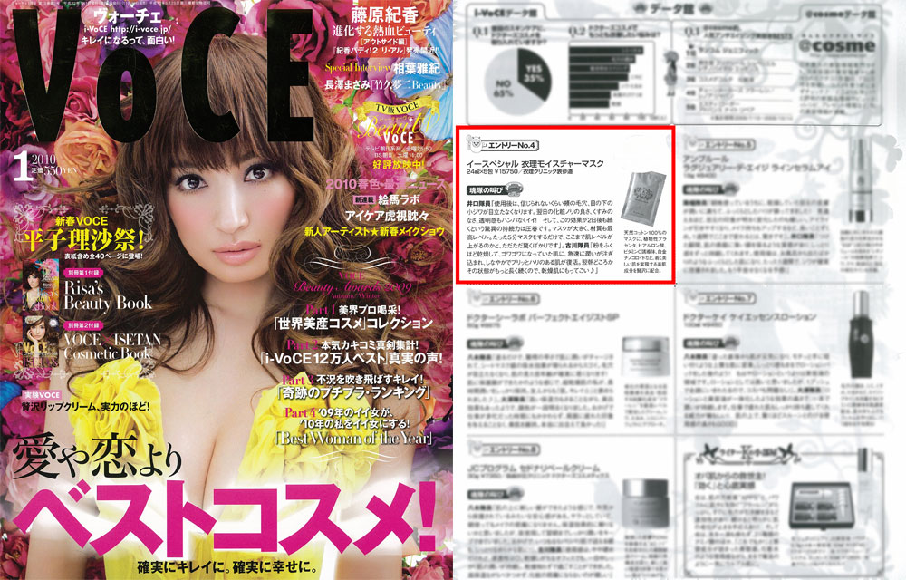 『VoCE』1月号「iVoCE魂」にて、衣理クリニック表参道院長 片桐衣理がプロデュースしたドクターズコスメ「イースペシャル 衣理モイスチャーマスク」が紹介されました。