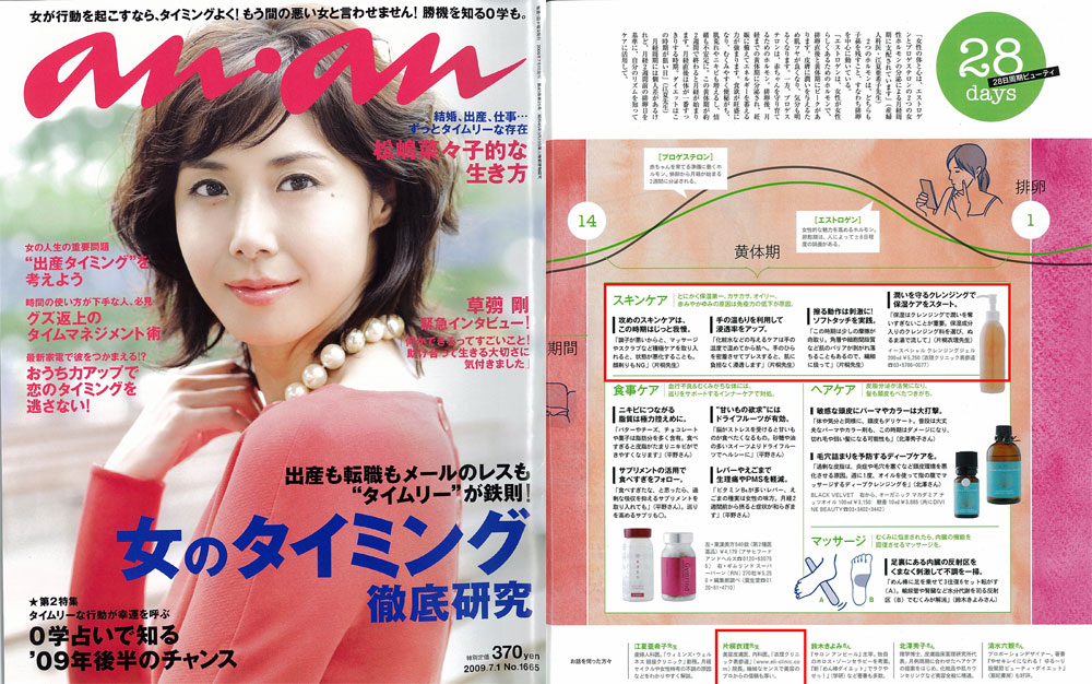 「anan」1665号企画「女の体内周期で美を整える。バイオリズムビューティーの法則」の中で、衣理クリニック表参道院長 片桐衣理が28日周期のスキンケアについてアドバイスとイースペシャルクレンジングジェルを紹介しています.
