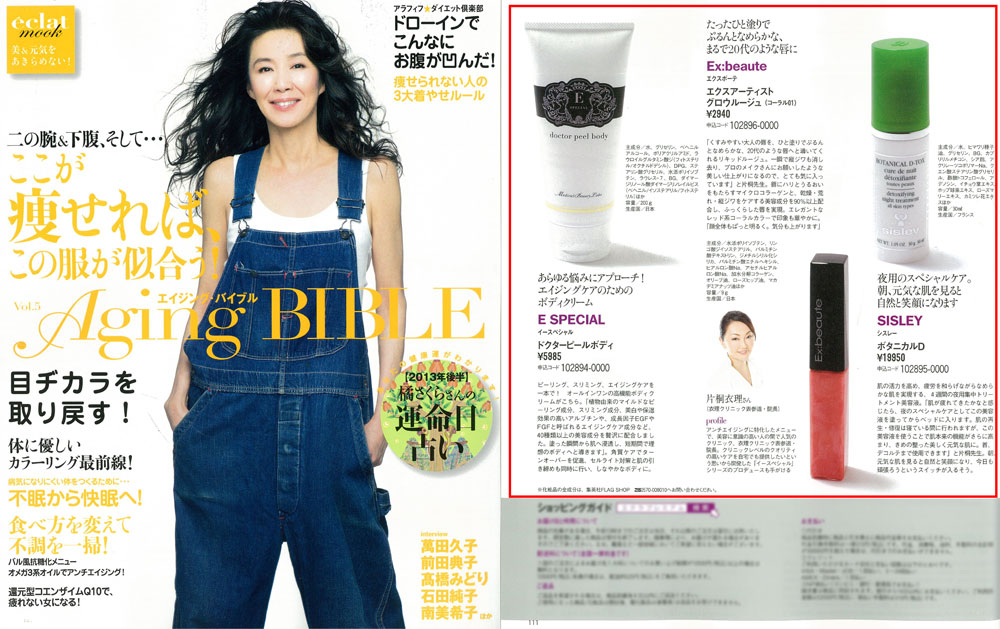 『Aging BIBLE』Vol.5、「料理家、美容家、女医たちの“愛用の逸品”通販スペシャル」にて、衣理クリニック表参道院長 片桐衣理が、おすすめのアイテムをご紹介させて頂きました。『イースペシャル ドクターピールボディ』もご紹介しております。是非、ご覧下さいませ。