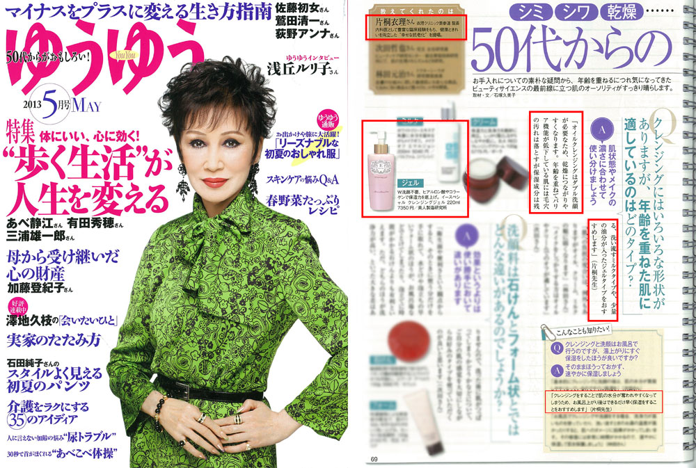 『ゆうゆう』5月号、「50代からのスキンケアQ&A」にて、衣理クリニック表参道院長 片桐衣理が、お肌のお手入れ法やアイテムの使い方などについてコメントさせていただきました。また、オリジナルコスメ“イースペシャル”から「クレンジングジェル」と「アクティブクリーム」をご紹介頂きました。