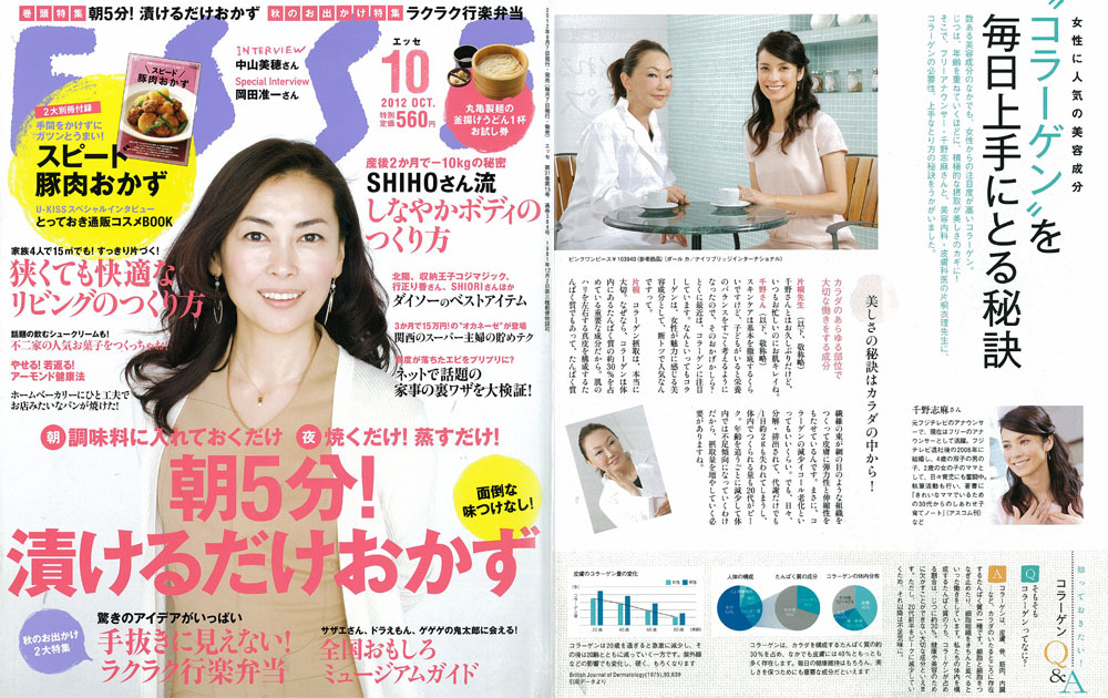 『ESSE』10月号、「“コラーゲン”を毎日上手に摂る秘訣」にて、衣理クリニック表参道院長 片桐衣理が、コラーゲンの必要性・上手なとり方について、フリーアナウンサーの千野志麻さんとの対談形式でお伝えさせて頂きました。その様子が掲載されておりますので、是非ご覧くださいませ。