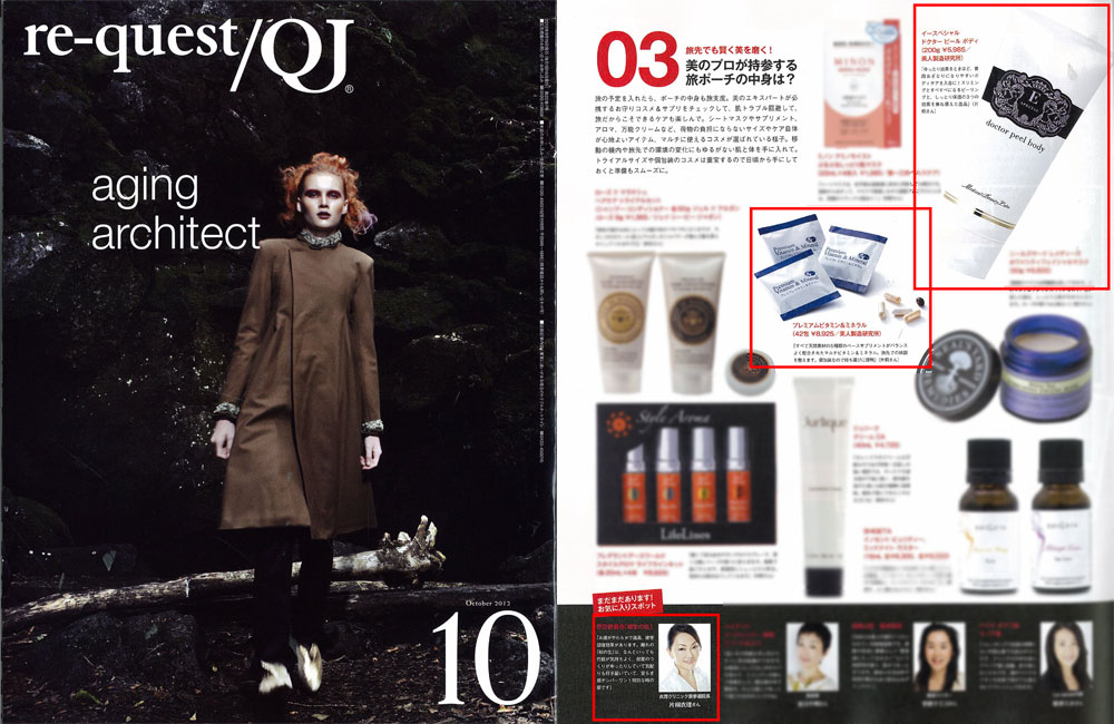 『re-quest/QJ』10月号、「秋の行楽シーズン到来!癒やしの旅ビューティ」にて、衣理クリニック表参道院長 片桐衣理が、トラベル美容について、おすすめのスポットや旅先グッヅをご紹介させて頂きました。自身のプロデュースするドクターズコスメ“イースペシャル”より、「ドクターピールボディ」や、サプリ「プレミアムビタミン&ミネラル」も掲載しております。是非、ご覧下さいませ。