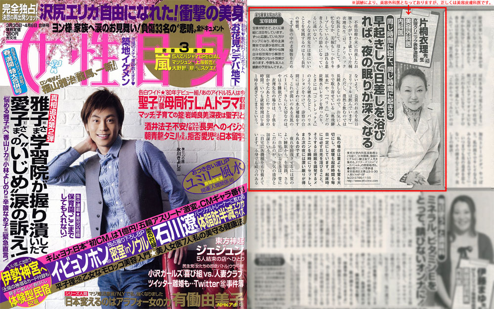 『女性自身』2439号、【7人の美人女医がオリジナルのテクニックをこっそり伝授!「美を守る健康法」教えます!】にて、衣理クリニック表参道院長 片桐衣理が日頃実践している健康法についてコメントさせていただきました。是非、ご覧下さいませ。