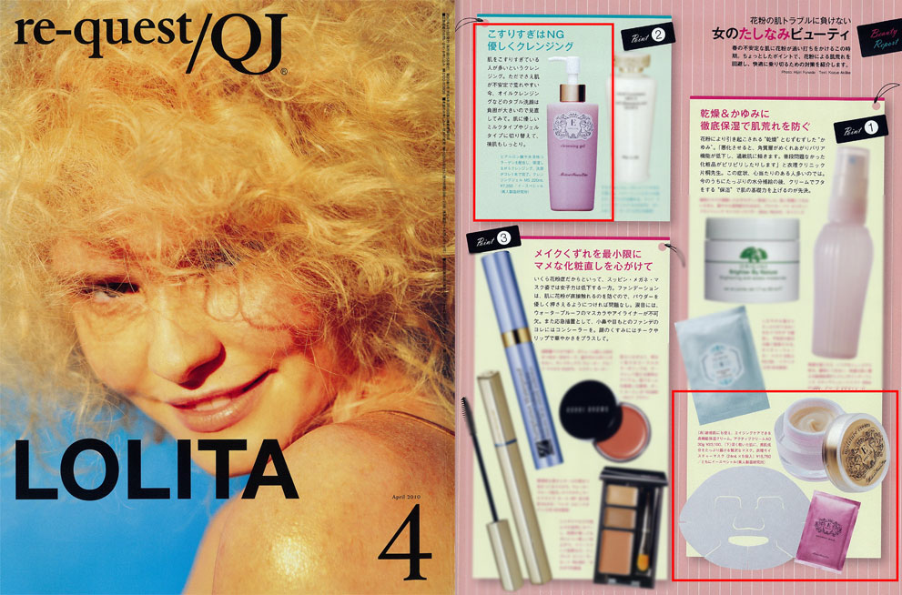 『re-quest/QJ』4月号、「女のたしなみビューティ」に衣理クリニック表参道院長 片桐衣理が春の肌トラブル・対策についてコメントさせていただきました。また、衣理院長が所長を務める美人製造研究所 イースペシャル「クレンジングジェル」「アクティブクリーム」「衣理モイスチャーマスク」をご紹介いただきました。