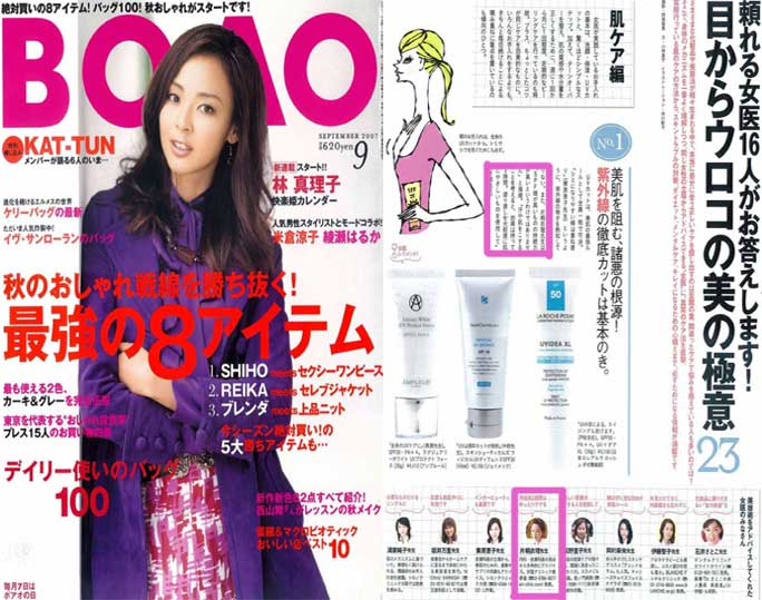 「BOAO9月号」企画「頼れる女医16人がお答えします!目からウロコの美の極意23」にて、衣理クリニック表参道(エリクリニック)院長 片桐衣理が「実際に行っているスキンケアの方法」等について、お答えしています。