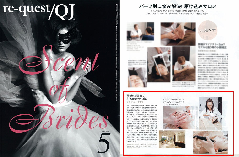 『re-quest/QJ』5月号、「検証!花嫁美メンテナンスガイド」にて、引き締まった小顔になるためのケアとして、衣理クリニック表参道オリジナルコース「小顔フェイスリフトスペシャル」をご紹介いただきました。