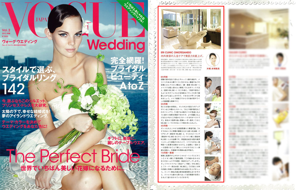 『VOGUE Wedding』Vol.2、「An Expert’s Eye」にて、衣理クリニック表参道が掲載されました。クリニック美容で美しくなるコツや、理想のブライダルプランを提案させて頂いております。是非、ご覧下さいませ。
