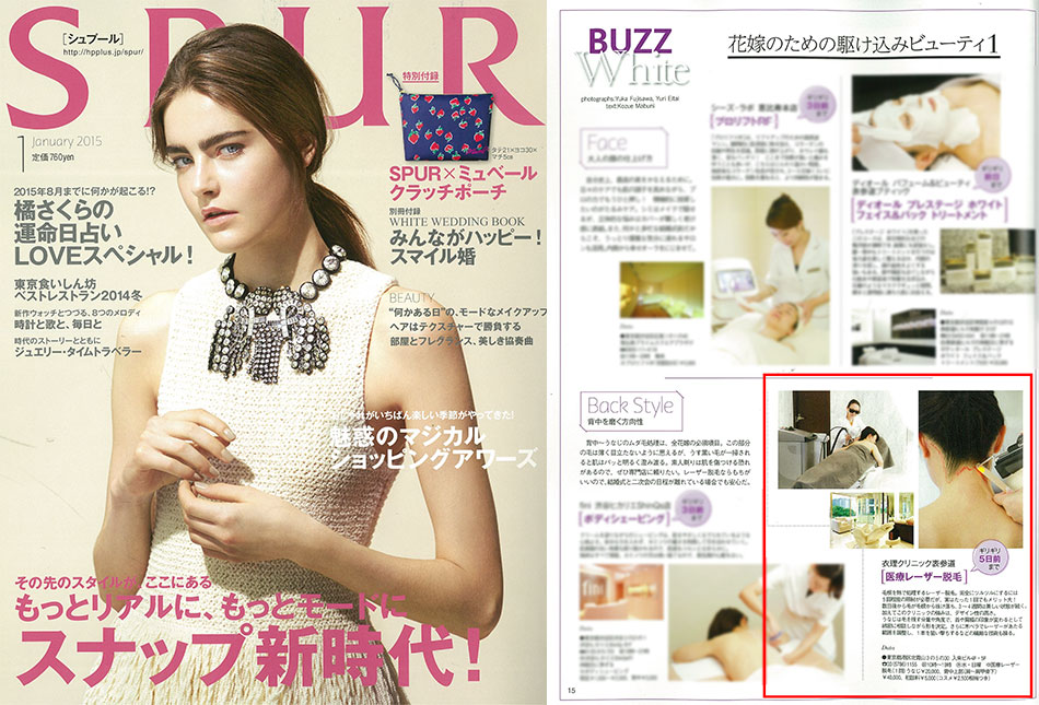 『SPUR』1月号別冊付録「SPUR White Wedding」にて、“花嫁のための駆け込みビューティスポット”の一つとして当院が掲載されました。『医療レーザー脱毛』をご紹介いただいております。