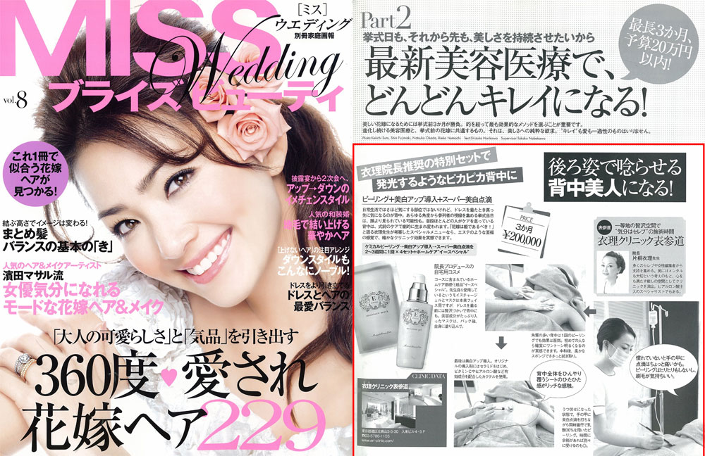 『MISS Wedding ブライズビューティ』vol.8「最新美容医療でどんどんキレイになる!」にて、背中美人を目指すための特別コースをご紹介させて頂きました。5月31日までの読者限定コース詳細が施術写真付きで掲載されておりますので是非、ご覧下さいませ。