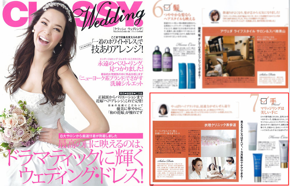 CLASSY.6月号増刊『CLASSY.Wedding』内特集、【ブライダル・ビューティ「ポイント7」】に、人気サロンとして衣理クリニック表参道が掲載されました。当院では、最高に美しい姿で挙式当日を迎えられるよう花嫁のサポートをしており、ブライダルメニューを多彩にご用意しております。今回その中から「ブライダルボディ」をご紹介させて頂きました。是非ご覧下さいませ。