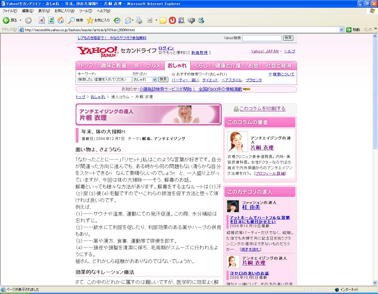 「Yahoo!セカンドライフ」にて“アンチエイジングの達人”として、衣理クリニック表参道(エリクリニック)院長 片桐衣理がコラムを連載しています。12月のテーマは、「年末、体の大掃除!!」です。