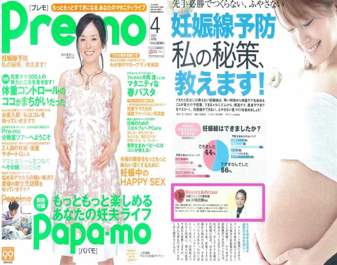 「プレモ4月号」企画「妊娠線予防 私の秘策、教えます!」の中で、衣理クリニック表参道(エリクリニック)院長 片桐衣理が「妊娠線のできるメカニズム、つくらないための保湿ケア」等についてアドバイスしています。また、イースペシャル(モイスチャージェル)が紹介されています。
