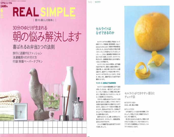 「リアルシンプル6月号」企画「気になるセルライトを解消する簡単マッサージ」中で、衣理クリニック表参道(エリクリニック)院長 片桐衣理が「セルライトができる原因と予防法について」解説しています。