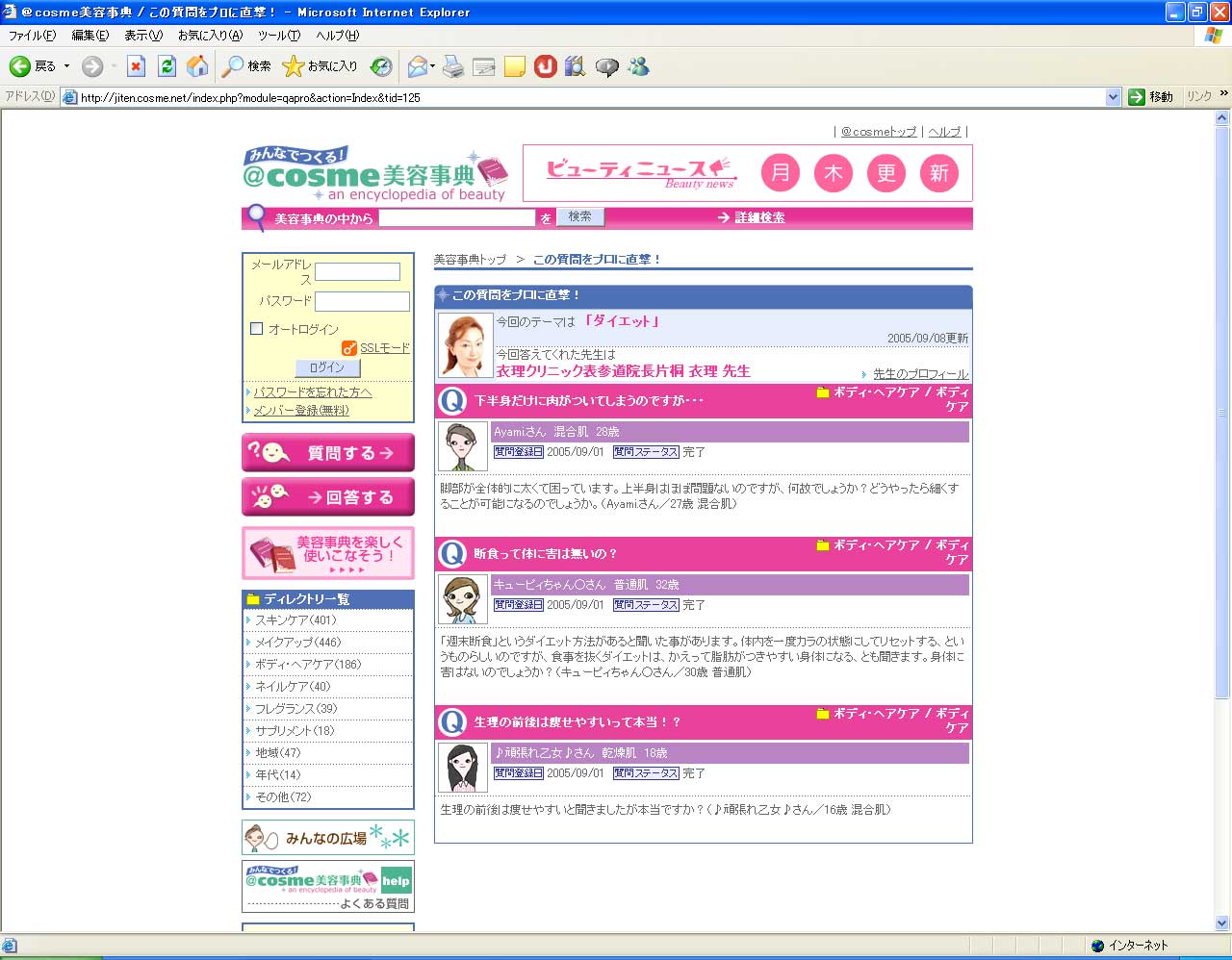 @cosme美容事典「この質問をプロに直撃!」の中で、衣理クリニック表参道(エリクリニック)院長 片桐衣理がコスメや美容の様々な疑問・お悩みにお答えしています。今回のテーマは 「ダイエット」です。