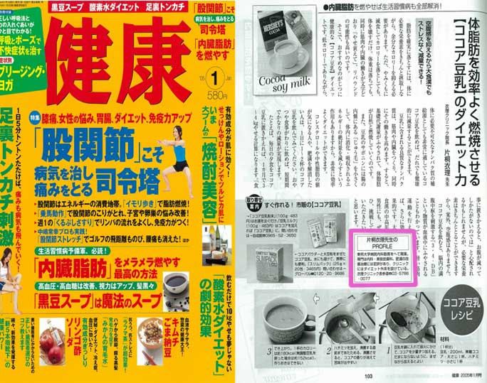 「健康1月号」の企画「内臓脂肪を燃やせば生活習慣病も全部解消!」の中で、体脂肪を効率よく燃焼させる「ココア豆乳」のダイエット力について、衣理クリニック表参道(エリクリニック)院長 片桐衣理がアドバイスしています。
