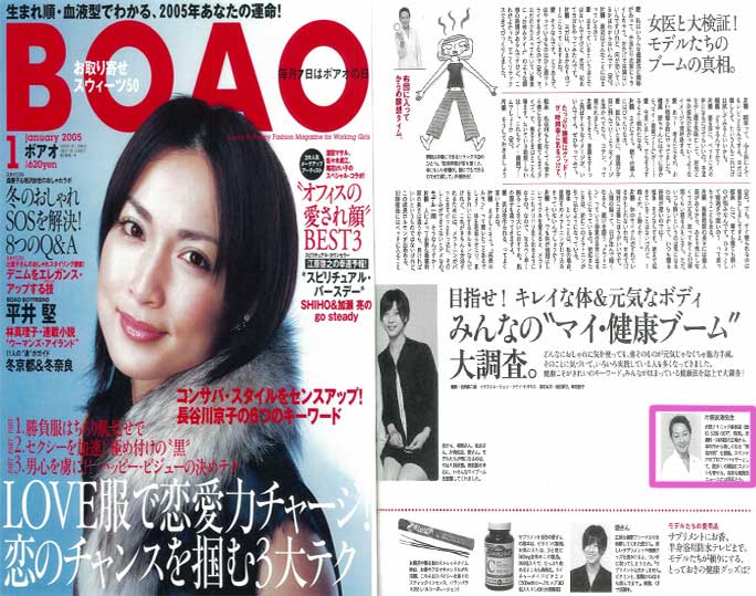 「ボアオ1月号」の企画「みんなの“マイ・健康ブーム”大調査」で、「女医と大検証!モデルたちのブームの真相」をテーマに、衣理クリニック表参道(エリクリニック)院長 片桐衣理がモデルたちの実践している健康法・美容法についてアドバイスしています。