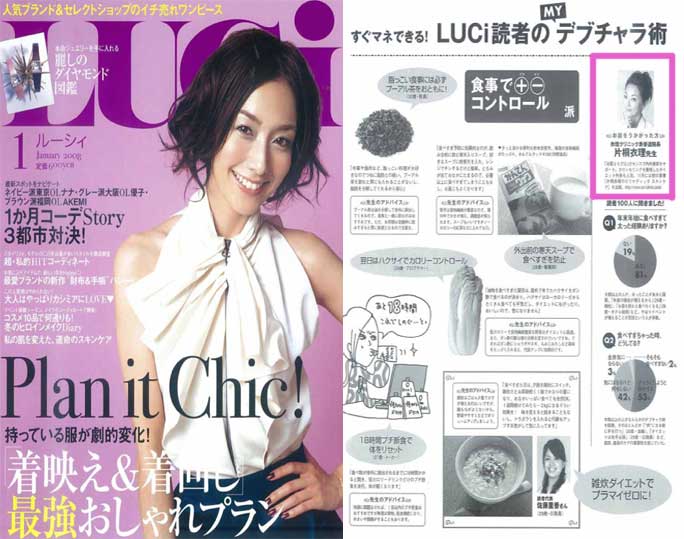 「LUCi1月号」企画「私の即効“デブチャラ”術」の中で、衣理クリニック表参道(エリクリニック)院長 片桐衣理が「読者のデブチャラ術(食べ過ぎをチャラにするテクニック)」に対して、アドバイスをしています。